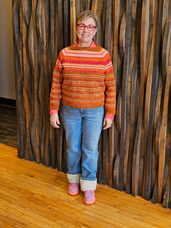 Sample 1, size 6, short sleeved and cropped, was knit in Leading Men Fiber Arts DK in colors: Midas Touch, Poison Apple, Heliotrope, Perfection, and Darkest Hour and weighed 347 grams using 868 yards. Each contrast color skein used approximately 40 grams.