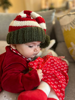 This classic holiday hat can be knit in seven sizes: baby (little elf) to adult large.
