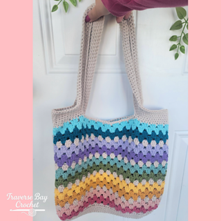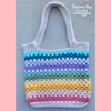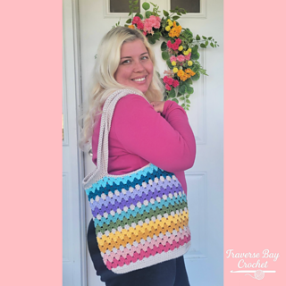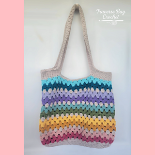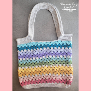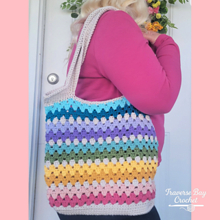 The bag is worked from the bottom up and features a sturdy oval base for added structure, with a beautiful striped granny stitch body and comfortable built-in handles.