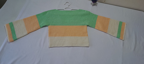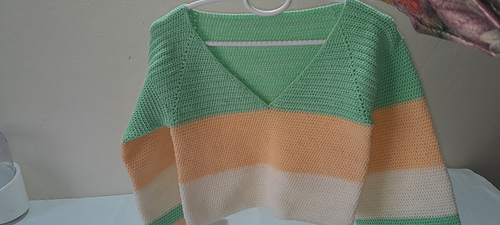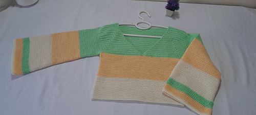 This striped crochet crop top is worked primarily in half double crochet stitches using a 3.0 mm hook. The body is constructed in the round from the hem upward. The front is then divided to shape a V-neckline, and sleeves are added directly to the shoulder openings and worked in rounds.