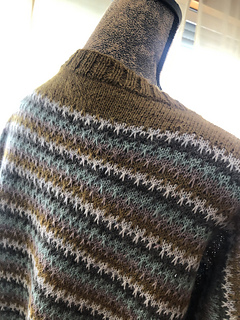 This boxy sweater is an interesting slip-stitch pattern where you can play with the stripes’ colours. It is knitted in fingering-weight yarn and a generous positive ease. The enchanting stitch pattern is easy to memorise and fun to work.
