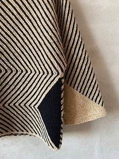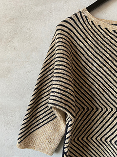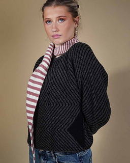 Studio is worked in ridges starting from one corner of the front piece (opposite the large colored triangle). Thereafter the sweater worked in one piece, which is finally knitted together over a slanted seam. The pattern is well illustrated with diagrams showing the knitting direction.