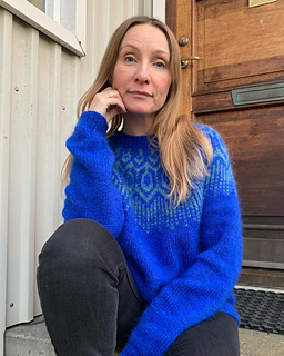 Stuðlaberg is a nearly-seamless yoke sweater, knit in the round from the bottom up. Body and sleeves are worked in the round from lower edge to underarms, then joined to work the yoke in the round. At the top of the body (back) are some extra rows worked back and forth to make it higher at the back. The body is a bit cropped and has extra ease for a more boyfriend look sweater.