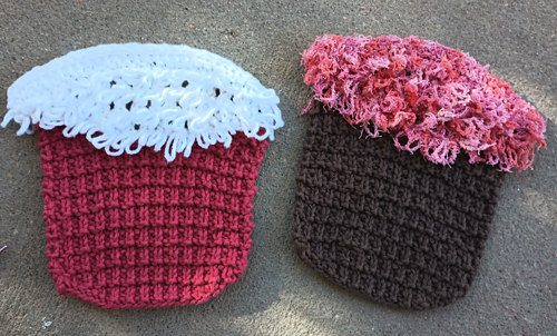 A frosted muffin with 2 textures for extra sud forming, scrubbing surfaces. Pattern is worked bottom up with short rows. Muffin top is worked in a mix of loop stitch and eyelet lace. Pattern is finished with an icord bind off over the top of the muffin.