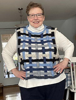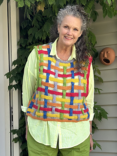 This pattern is worked in pieces, one front and one back, from the bottom up. You begin with a hemmed edge then continue in “woven knitting”. The neckband and armhole edges are added later.