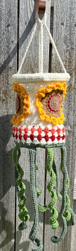 Sample yarns: Red Heart Super Saver Aran, Cafe, Saffron, Lt Sage, Coral, Ranch Red, Gold; Bernat Super Value Lush, Bright Yellow; Impeccable Gold