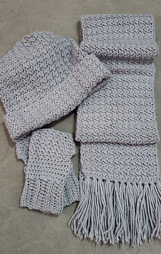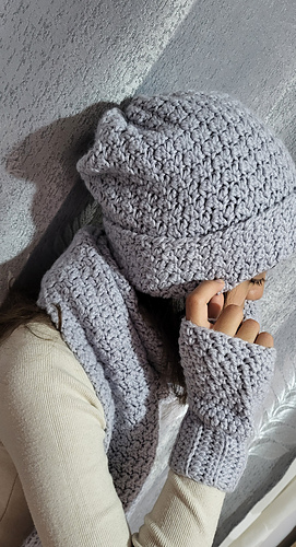 This 3 Piece Set includes patterns for a scarf, beanie, and fingerless gloves. Perfect Handmade Gift or addition to your winter wardrobe.