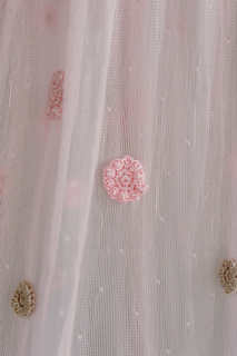 ● Two pink net or lace curtains, 145 x 300cm/57 x 118in