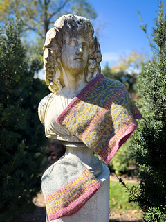 • 1 Hank each color Happy Go Knitty Ahuru 8 (3.5 oz/100 g ea approx. 260 yds/238 m, 80% merino, 20% possum) in Magnolia Tree (pink, CC1), Custard Apple (yellow, CC2), and Tui (blue, CC3)