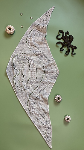 Rautenförmiger Schal mit seitlichen I-Cords und erhabenen Tentakeln. Diese werden aus rechten Maschen, Umschlägen, Verkreuzungen und Noppen gebildet und erheben sich über einem Meer von linken Maschen.
