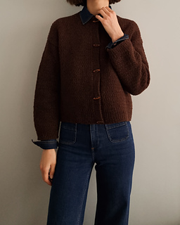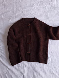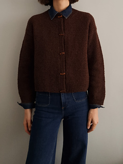 The cardigan is knitted in a dedicated stitch pattern from the top down, seamlessly. The back is worked first, followed by the shoulders. Once the back and fronts are joined, they are knitted together flat and finished with a 1x1 rib hem. The sleeves are then worked in the round. Next, stitches are picked up along the front edges to create plackets, which are worked in 1x1 rib, and then, the stitches are picked up along the neckline to make the neckband, also in a 1x1 rib. Finally, toggle buttons are sewn on after the cardigan is finished.