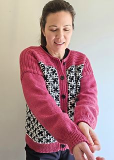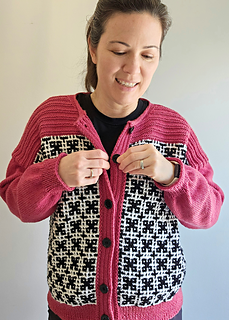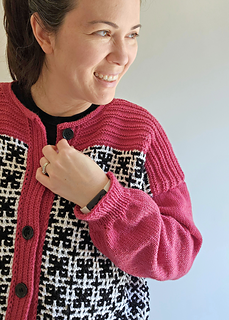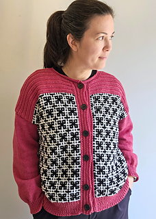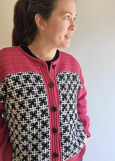Tessera Cardigan is a modern DK-weight cardigan inspired by the geometry of mosaic tiles. The shoulders are worked in a solid color with textured garter ridges creating structure and visual contrast. The body features high-contrast mosaic colorwork created by a series of slipped stitches for bold patterning and easy knitting. With clean lines and approachable techniques, Tessera balances visual interest with everyday wearability.