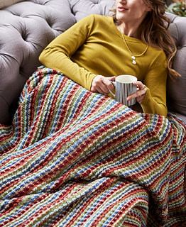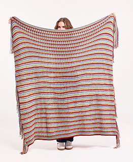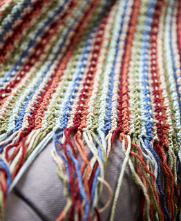 This Blanket is worked flat from end to end; a circular needle is used to accommodate the large number of stitches. Leave a long tail, approximately 8”, when joining a new color at both the beginning and end of each color. One side will have all the ends and then fringe will be added to the other side.