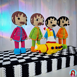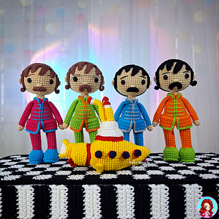 This listing is for a digital crochet pattern (PDF) to make four amigurumi dolls inspired by legendary musicians from Liverpool and a whimsical yellow submarine.