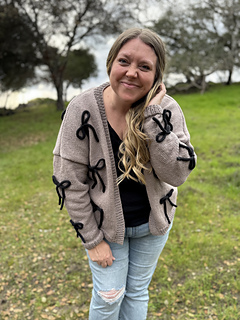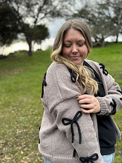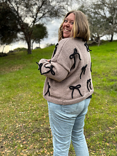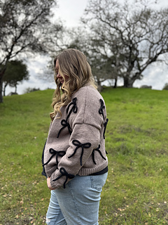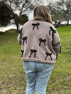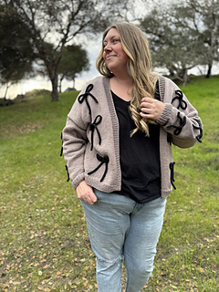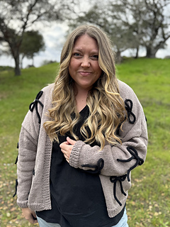 This cozy cardigan is knit in buttery-soft Feels Like Butta yarn from Lion Brand using classic stockinette stitch and an easy, approachable construction. Delicate bows made from coordinating knitted I-cord are tacked on for a fun, feminine detail you can customize. Simple to make but full of personality, this pattern is perfect for knitters looking for an easy win with a little extra flair.