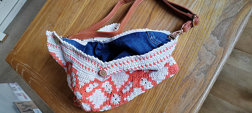 The bag is fully lined with hand-sewn denim repurposed from old jeans, giving it extra durability and a touch of sustainable charm.