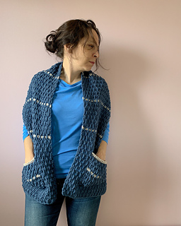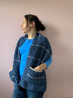 A cosy, textured pocket shawl, made using aran / heavy worsted weight yarn with thin stripes in a contrasting colour.