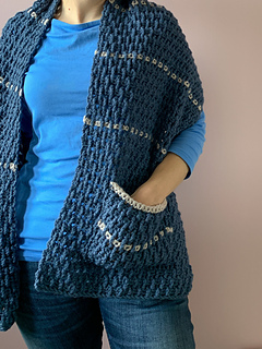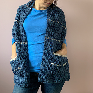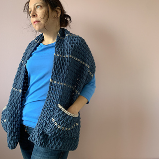 This pattern is designed for adults. After blocking, the finished shawl pictured measures 35cm wide by 155cm long. The pockets each measure 20cm wide by 17cm tall post-blocking.