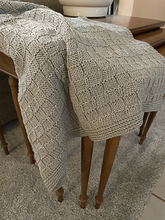 Blanket knit flat, in one piece, back and forth on circular knitting needles in order to accommodate the large number of stitches.