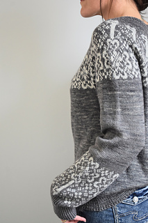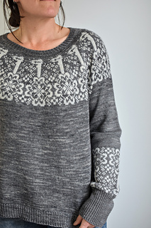 The Keys is a circular yoke worked top down. After the stranded colourwork yoke is worked in the round, stitches are divided for body and sleeves, underarm stitches are cast on, and the lower body is worked in the round to the hem. Sleeves are worked in the round down to the cuffs, where more stranded colourwork is worked just before the cuff ribbing.