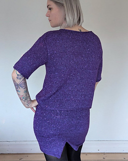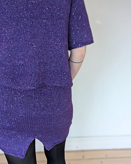 The Party Skirt is a short, tight skirt with a slip in the back. The Skirt has an I-cord in the lining and is knit from the top down. The length can easily be personalized.
