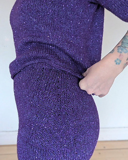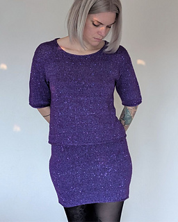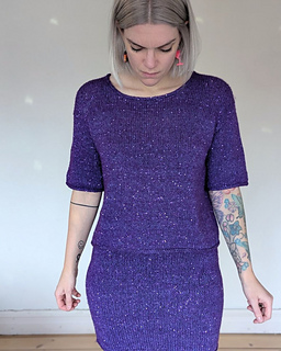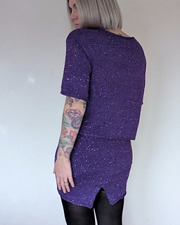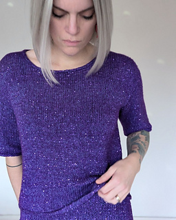 The Party Tee är en croppad T-shirt med en lätt båtringning och rak passform. Den stickas sömlöst uppifrån och ner. Längd och ärmlängd kan enkelt ändras efter önskemål.