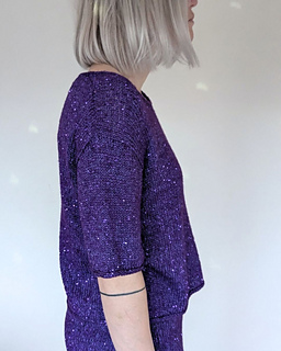 The Party Tee is a cropped tee with a slight boat neck and a straight fit. It is knit from the top down. Both length and sleeve length can easily be personalized.