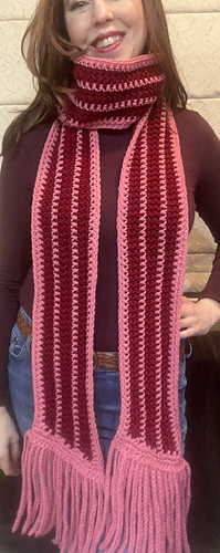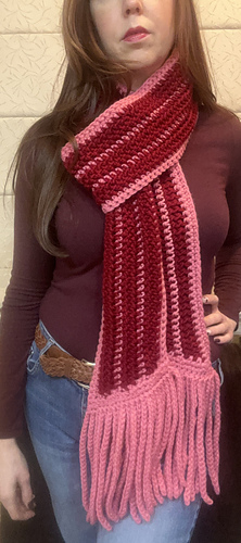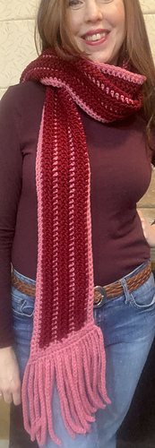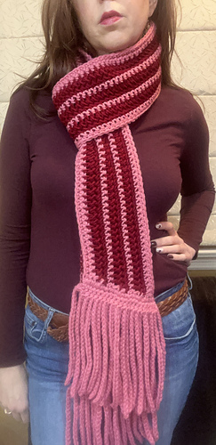 The Priscilla scarf can be made as long or as short as you would like. The fringe is crocheted onto the scarf, but is completely optional if you don’t like fringe. Any yarn or hook size can be used to make this project. Worsted weight yarn and size K hook are suggestions only. Feel free to use as many colors as desired.