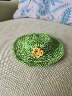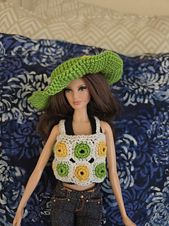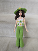 Seventies outfit: lime green bell-bottoms, belt, granny square top, floppy hat.