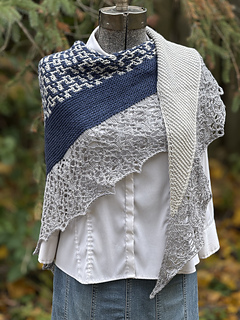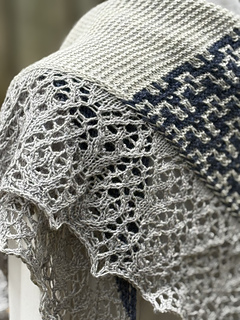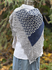 The Sun, The Moon, And The Stars is a symmetrical triangular shawl that starts at one corner and works across to the far edge. The body of the shawl is worked in two colours of dk weight yarn in bands of solid garter stitch and mosaic colourwork. A lace border of fingering weight yarn is then worked on the two lower edges of the shawl. This border is picked up on one side, then worked across the live stitches of the body section.