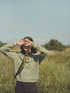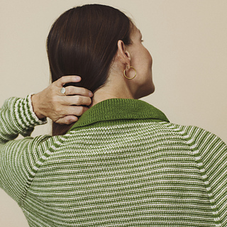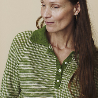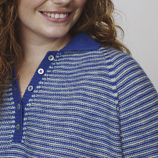 The Thekla Polo is worked from the top-down in reverse stockinette stitch with narrow stripes in two colors. The collar and yoke are worked back and forth using short rows and raglan increases. The body and sleeves are worked in the round in stockinette stitch so that the knit side faces outward. Color changes are made on the right side to avoid visible joins. Finally, the work is turned inside out so that the purl side with the neat stripes is visible, and button bands are added along the front panels.