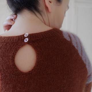 This sweater is worked 2 strands held together, top-down without seams. You’ll begin working flat with the MC for the neckline (it has an opening with two buttons at the back).