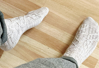 Size 2: Work with 6 ply sock yarn or a sport weight yarn and needles US 2.5/3mm in cable pattern for more circumference at the leg and the foot.