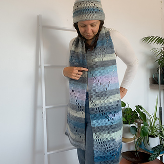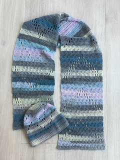 The hat and scarf are one size and intended for adult use. The finished scarf measures 170cm / 68in long by 26cm/0.5in wide after a gentle blocking