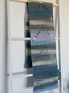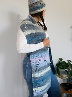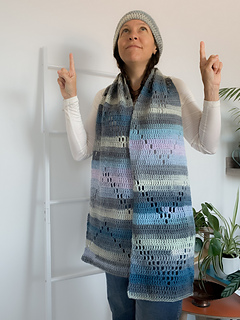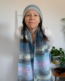 ‘This way up’ is a cosy adult size beanie hat and scarf pattern made in worsted weight roving self striping yarn. The fun filet crochet chevrons point the way.