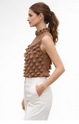 The Thorn Vest is an oversized top worked seamlessly from the top down. The design begins with a round-knit turtleneck, then splits into separate front and back sections. The body features a spike stitch pattern that creates a beautifully textured fabric with generous stretch, making it flattering and comfortable for all body types.