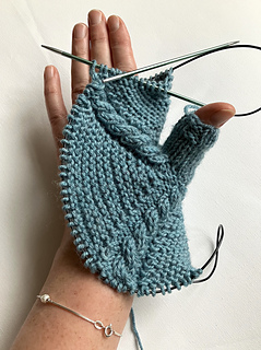 Thumbs Up are fingerless mittens that are knit starting from the thumb. The hand, in squishy garter stitch combined with diagonal cables, is worked around the thumb, forming a square. When it reaches the desired width, the square is folded and its two sides are joined on the bind off row.