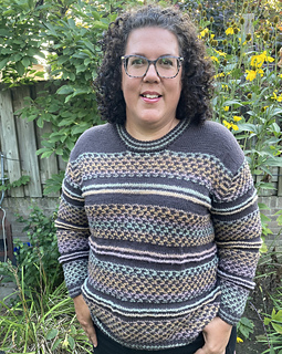 The sweater itself has a classic crewneck and is worked seamlessly from the top down. I used a European shoulder and a drop-shoulder construction, with the sleeves worked at the same time as the yoke. One of my favourite things about this design is that you can customise the length of the different stitch pattern sections. So, if you want a simpler sweater, just do more of the stockinette. Or maybe you’re really loving the two-colour thorn stitch – you can totally highlight that too! The construction alone is sure to keep you engaged.