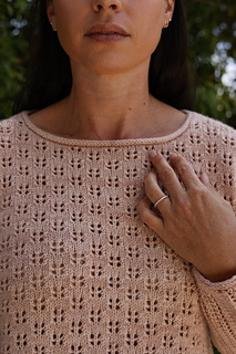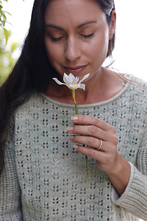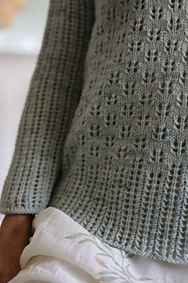 This pullover is my homage to these beautiful marshes and the grass that borders the creek pathway. It starts with a simple eyelet lace stitch pattern at the hem that evokes the tall marsh grass and transitions to a more delicate lace pattern that represents how the grass eases into the sky and the clouds floating above.