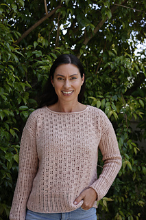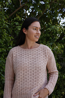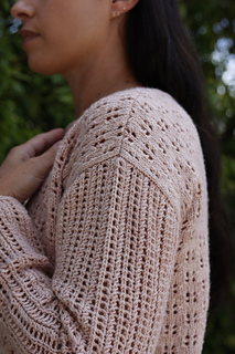 The body of Tidal Creek is worked flat in pieces from the bottom up and seamed. Armhole shaping is worked to keep the drop shoulder seam location consistent across the size range. The drop shoulders are shaped with a sloped bind off, and instructions are provided for an optional cup shaping with short rows.