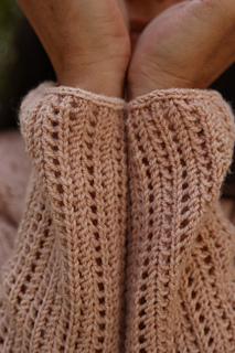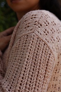 Once the body pieces are completed and seamed, stitches are picked up around the armhole and worked from the bicep to the cuff in the round with a few short rows to create a gentle cap for an optimal fit and easy movement in the underarm.