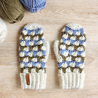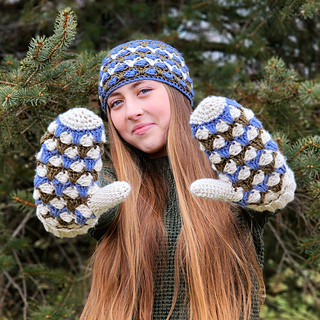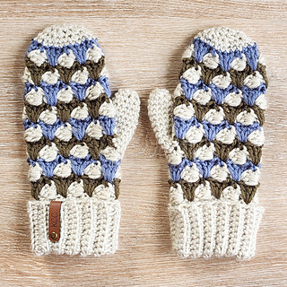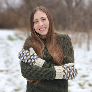 The Timber Hill Mittens will keep your hands warm all winter long! They are made with worsted weight yarn in a striped pattern. The distinctive design is created with cluster stitches and spike stitches. The mittens have a warm double cuff, and instructions are also given for making a fingerless mitts version.