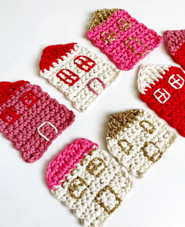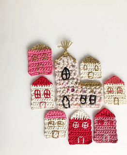 Yarn: Sport weight cotton yarn (I used Rito Hobby’s Infinity Hearts Lotus 8/4) in your chosen colours for roof and house body, plus combinations of Rico Creative Lamé and Drops Alpaca in Coral, plus scraps of DK/Sport weight yarn for embellishments and embroidery.