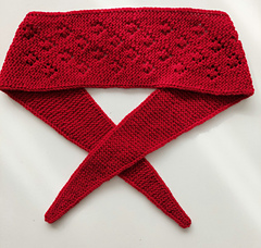 Add a touch of color to your outfit with this little, charming scarf tied around your neck or wrapped in your hair. A quick knit in garter stitch with lacy strawberries motif is perfect for beginners.