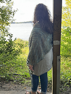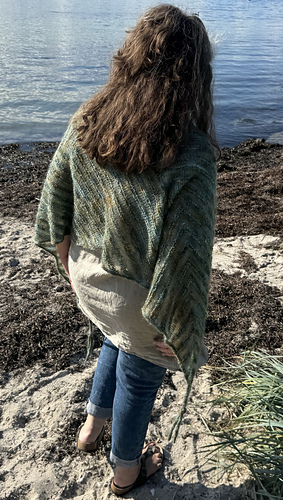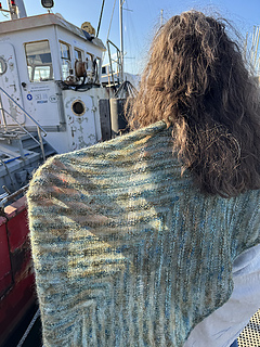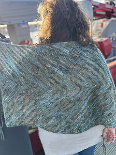 Der TITANIC Shawl ist mein spezielles Design für unser Berlin Knits Yarnfestival 2025. Der Veranstaltungsort ist das TITANIC Hotel im Herzen Berlins – somit war es klar, dass es eine spezielle Frida Fuchs Farbe geben wird, die davon inspiriert ist. Für das Original habe ich ein „laceweight“ Seidenmohair und ein „fingering weight“ Seidenboucle in dieser TITANIC Sonder-Farbe gewählt. Mit nur je einem Strang beider Garne kann man ein ziemlich großes leichtgewichtiges Tuch stricken – mit transparenten Streifen, die durch das dünne Seidenmohair entstehen. Die Form eines in die Länge gezogenen Diamanten erreicht man durch clever platzierte Zu- und Abnahmen.