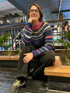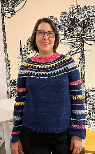 Carnaval is worked from the top down, with a circular yoke that combines two techniques: knitting and crochet. This combination creates textures and joins that evoke the idea of linked pennants.