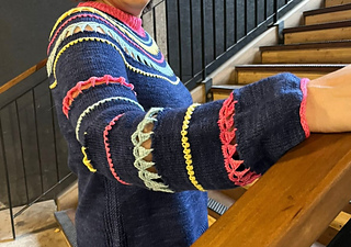 Esta franja —al igual que las siguientes— se trabaja en punto jersey e incorpora, en la parte central, algunas vueltas del punto tinny bobbles en un color de contraste. Al finalizar la franja, se une al bloque del cuello mediante crochet, utilizando un punto que genera pequeños triángulos y que simula banderines.