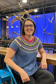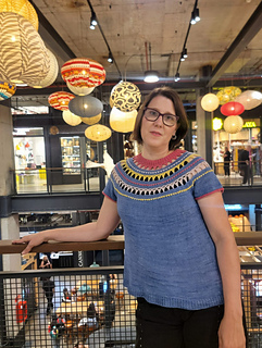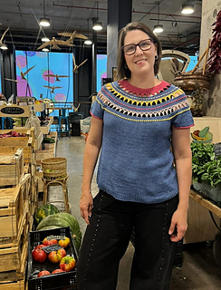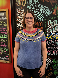 It begins at the neck, which is worked in twisted rib. Once finished, the stitches are bound off and left aside, and the stitches for the first yoke block are cast on. This first block includes increases that allow the yoke to begin growing.