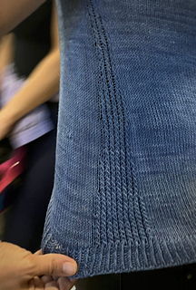 Una vez finalizado el canesú, se separan cuerpo y mangas, dejando estas últimas en espera. El cuerpo se continúa tejiendo en el color principal, en punto jersey, pero incorpora algunos aumentos en los laterales que le da una leve forma de A. En los laterales, se incorpora un punto que he llamado “cruzado”. Se finaliza el cuerpo con una pretina en elástico retorcido.
