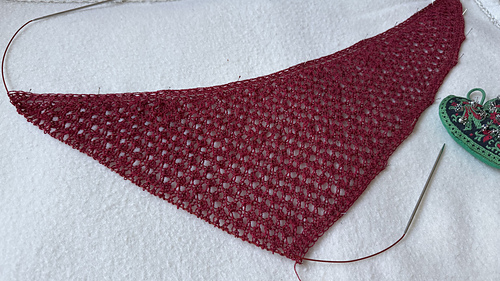 Das Tuch ist ein asymmetrisches Dreieck. Es ist flach, so dass es gut als Schalersatz verwendet werden kann. Mit unter 150 Gramm ist es recht leicht. Halskante ca. 140+ cm. Von der Halskante zur Spitze ca. 35 cm.